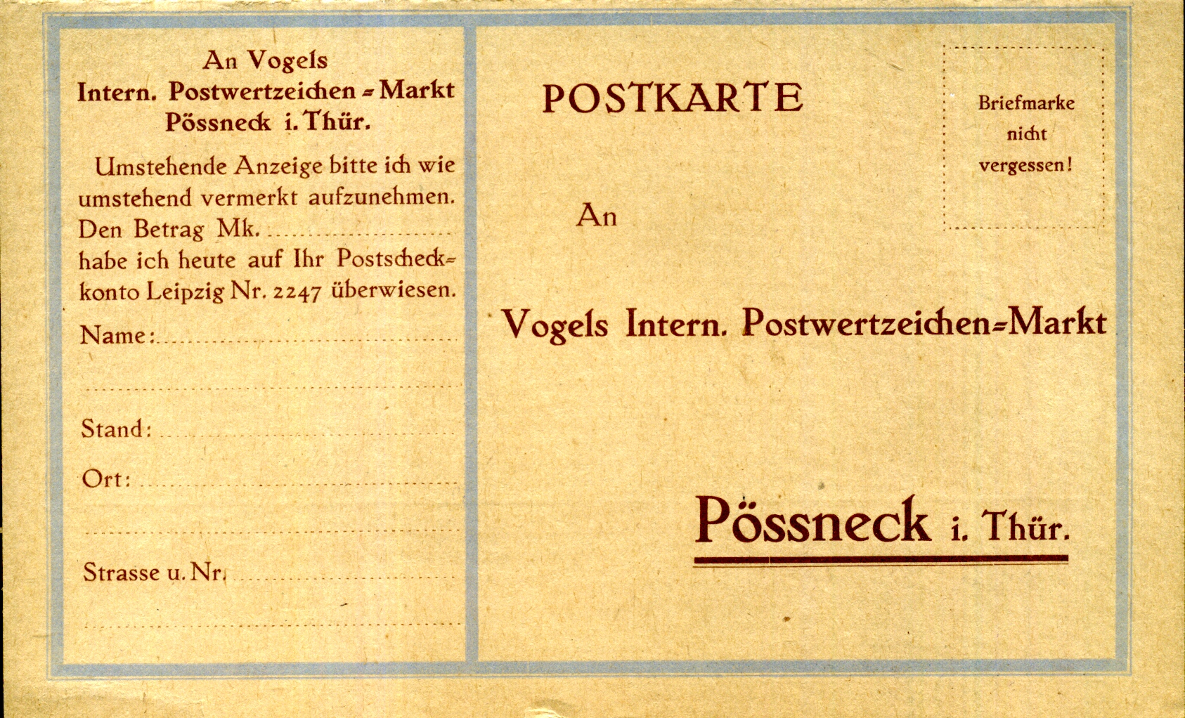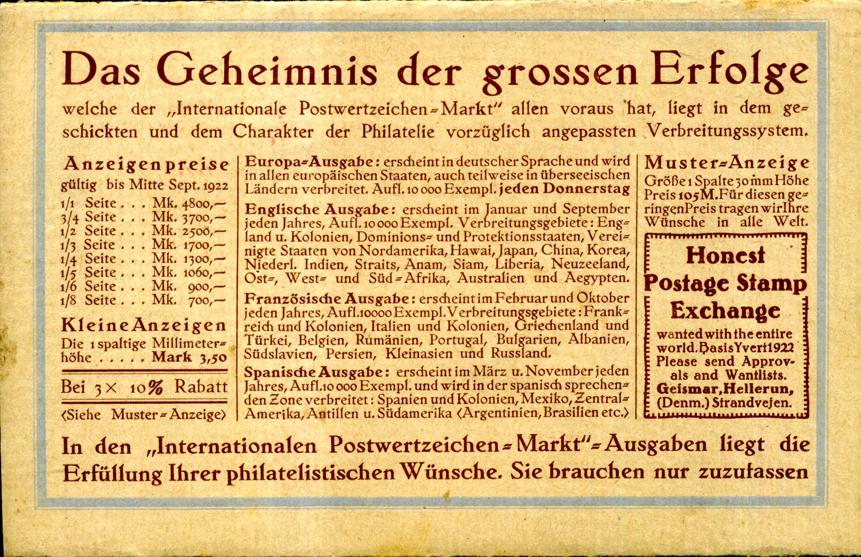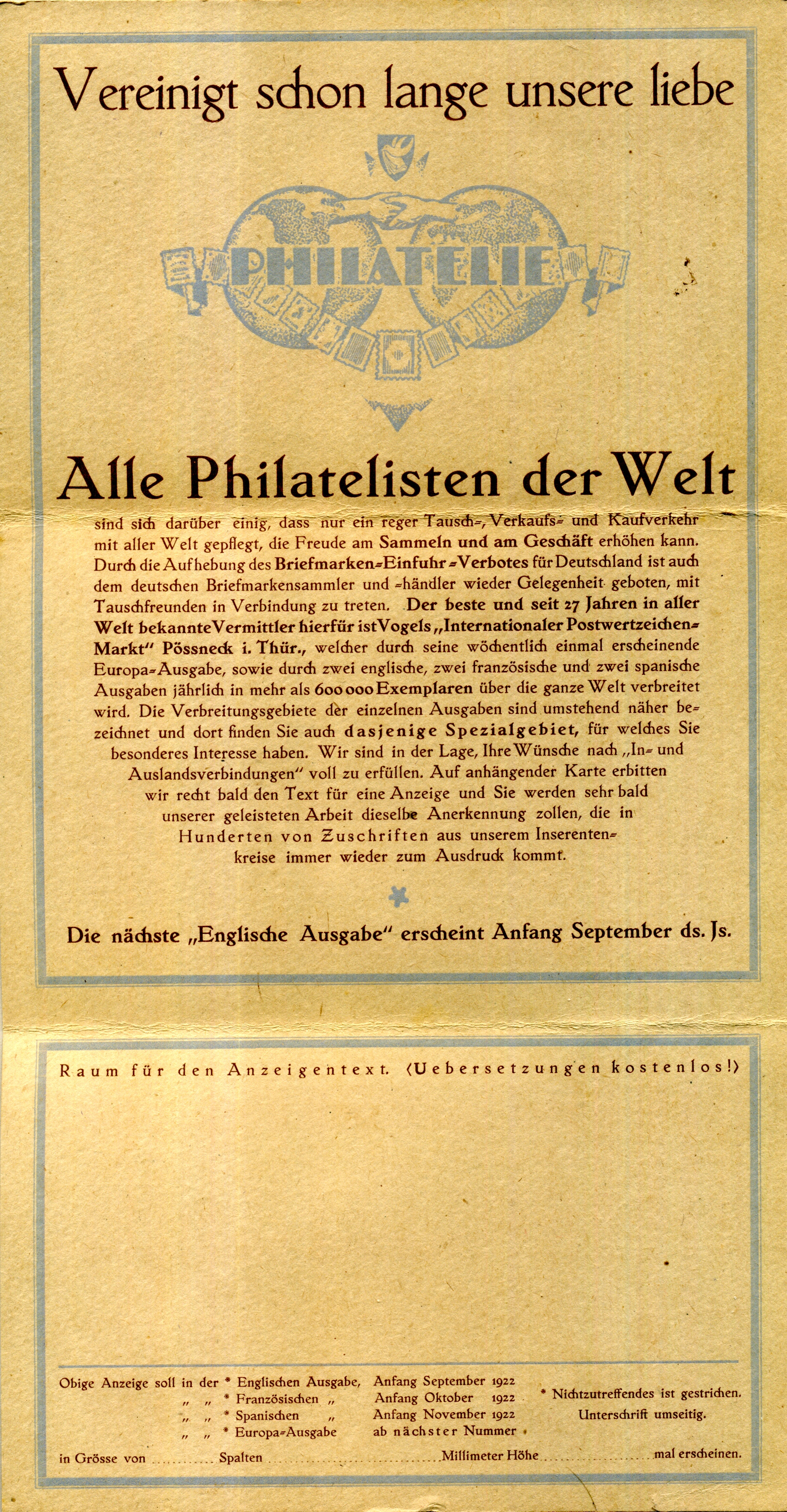 Bei den Anzeigenpreisen sieht man schon deutlicher als bei der Portohöhe des Freistempels, dass wir uns in der beginnenden Inflation befinden. Beim Googlen nach Vogels Intern. Postwertzeichen-Markt landet man recht schnell bei der heute in Würzburg ansässigen Vogel Communications Group, einem weltweit tätigen Spezialisten für individuelle und zeitgemäße B2B-Kommunikationslösungen. Was 1891 als Hobby eines Philatelisten begann, der Kontakte zu den Sammlern in aller Welt suchte, ernährt heute 820 Mitarbeiterinnen weltweit. "Zugpferd" des Verlages, der weit über 100 Fachzeitschriften herausgibt, ist der 1894 erstmals erschienene MM Maschinenmarkt. Ein philatelistisches Magazin habe ich im aktuellen Portfolio nicht entdecken können.