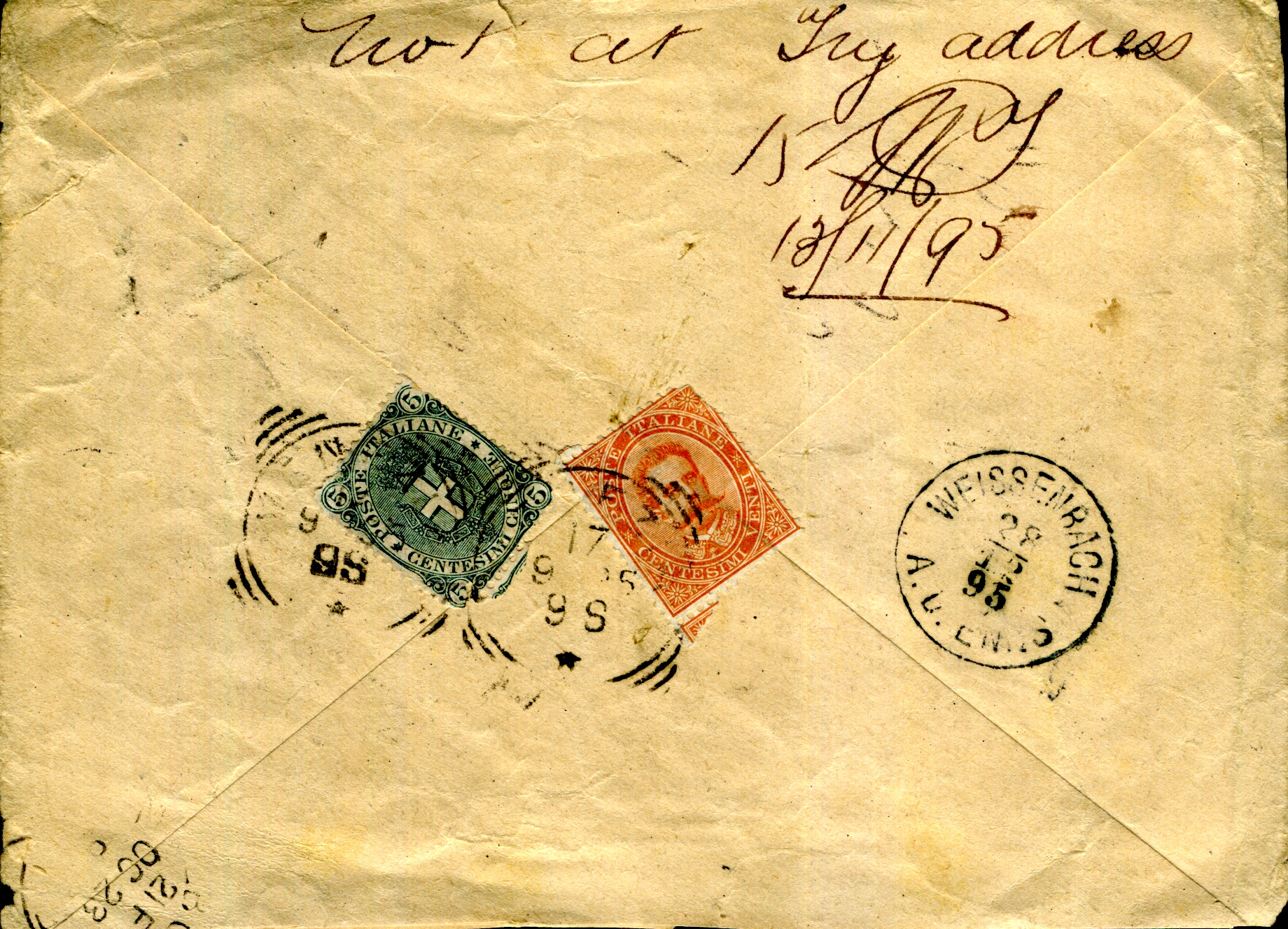 In Melbourne hat man sich wohl ein wenig mehr Mühe gemacht - und den Brief wohl im Saal der Briefträger ausgerufen: und dann den Stempel "NOT KNOW BY LETTER CARRIERS MELBOURNE" abgeschlagen. Vermutlich bezieht sich das rückseitige "Not at thy address / Unterschrift 13/11/95" auf einen Zustellversuch im "Sailors Home". Und in Melbourne scheint man sich die Adresse ein wenig näher angeschaut zu haben: sicherlich wurde hier der handschriftliche Vermerk "In Alsace, Germany" angebracht. Noch nicht ganz richtig, aber die anscheinend ausreichend, dass der Brief ohne weitere Umleitungen in Weissenbach in der Steiermark zugestellt werden konnte.