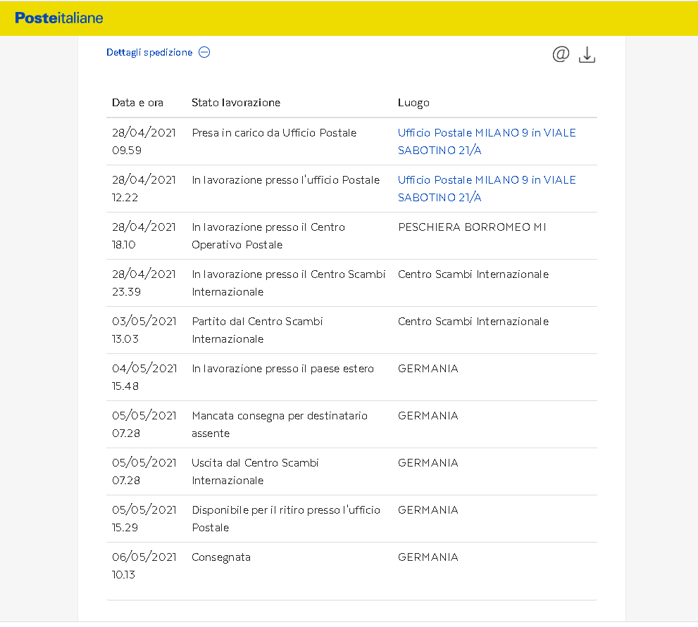 Der Sendungsverlauf gemäß der Sendungsverfolgung der PosteItaliane