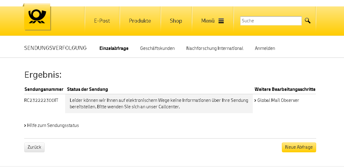 Das abholen der Sendung hat bei PosteItaliane nichts geändert (merhr als "geliefert" geht ja auch nicht), aber bei der Deutschen Post änderte sich was: die Trackingnummer wurde gefunden, aber man können keinen Status anzeigen (mit dem Hinweis in den Erläuterungen, dass dies in der Regel bedeute, dass es unterschiedliche Statusmeldungen gäbe ...