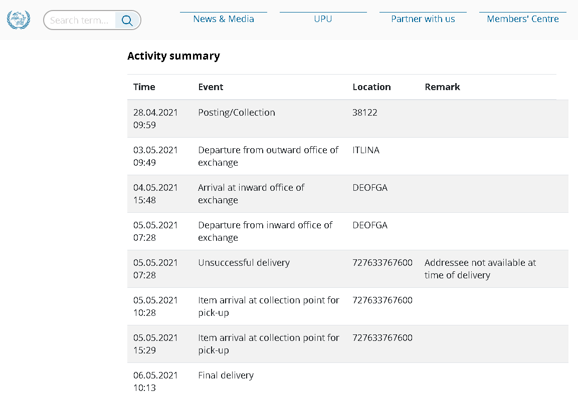 Nochmal zurück zu den Laufwegen: PosteItaliane stellt für den ttalienischen Teil der Reise in der Regel recht genaue Orts-Informationen zur Verfügung. Wenn die Sendung "fliegt" ist auch der Eingangsflughafen (in der Regel Frankfurt, aber ich habe auch schon München gesehen) noch benannt, die anderen Orte heiße meist "Germania". Die Suche des Weltpostvereins "entschlüsselt" (anders als die Seite der PosteItaliane) die Ortscodes nicht, sodass zumindestens die Sortierzentren sich eindeutig bestimmen lassen: