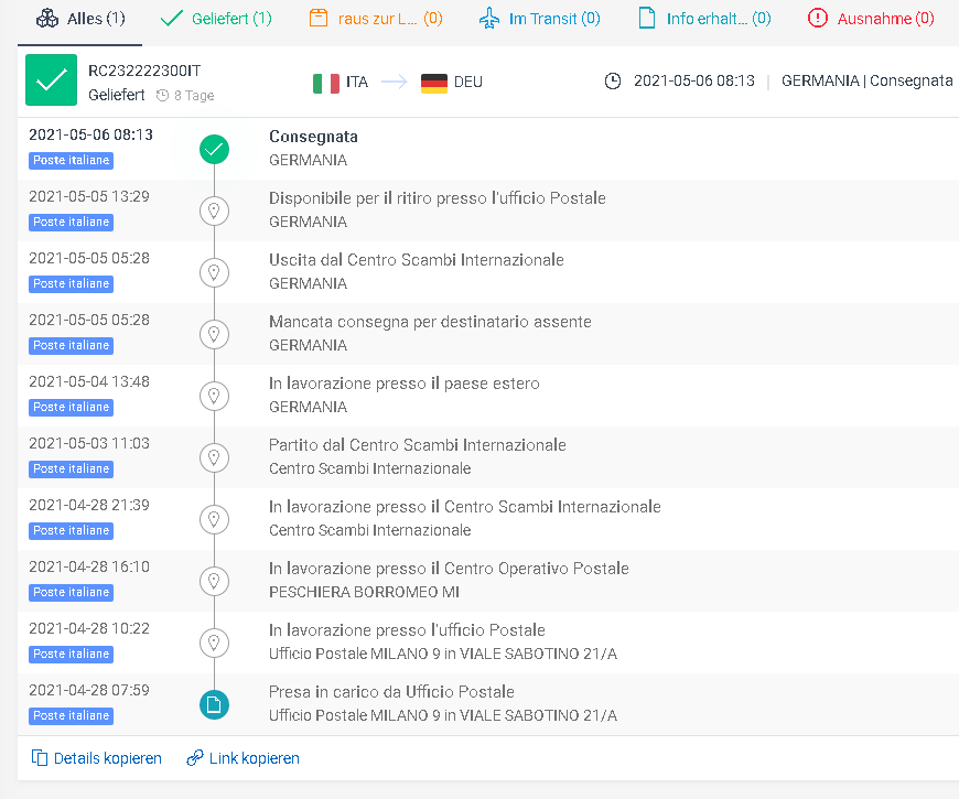 Wurden bis vor einigen Monaten Einschreibbriefe aus Italien nach Deutschland beim Eingang in Deutschland "umnummeriert", sodaß die Sendungsverfolgung der PosteItaliane nach der Übergabe an die Deutsche Post keine Informationen lieferte, lassen sich die Sendungen heute bei der PosteItaliane bis zum Empfänger verfolgen - wenn alles richtig läuft.