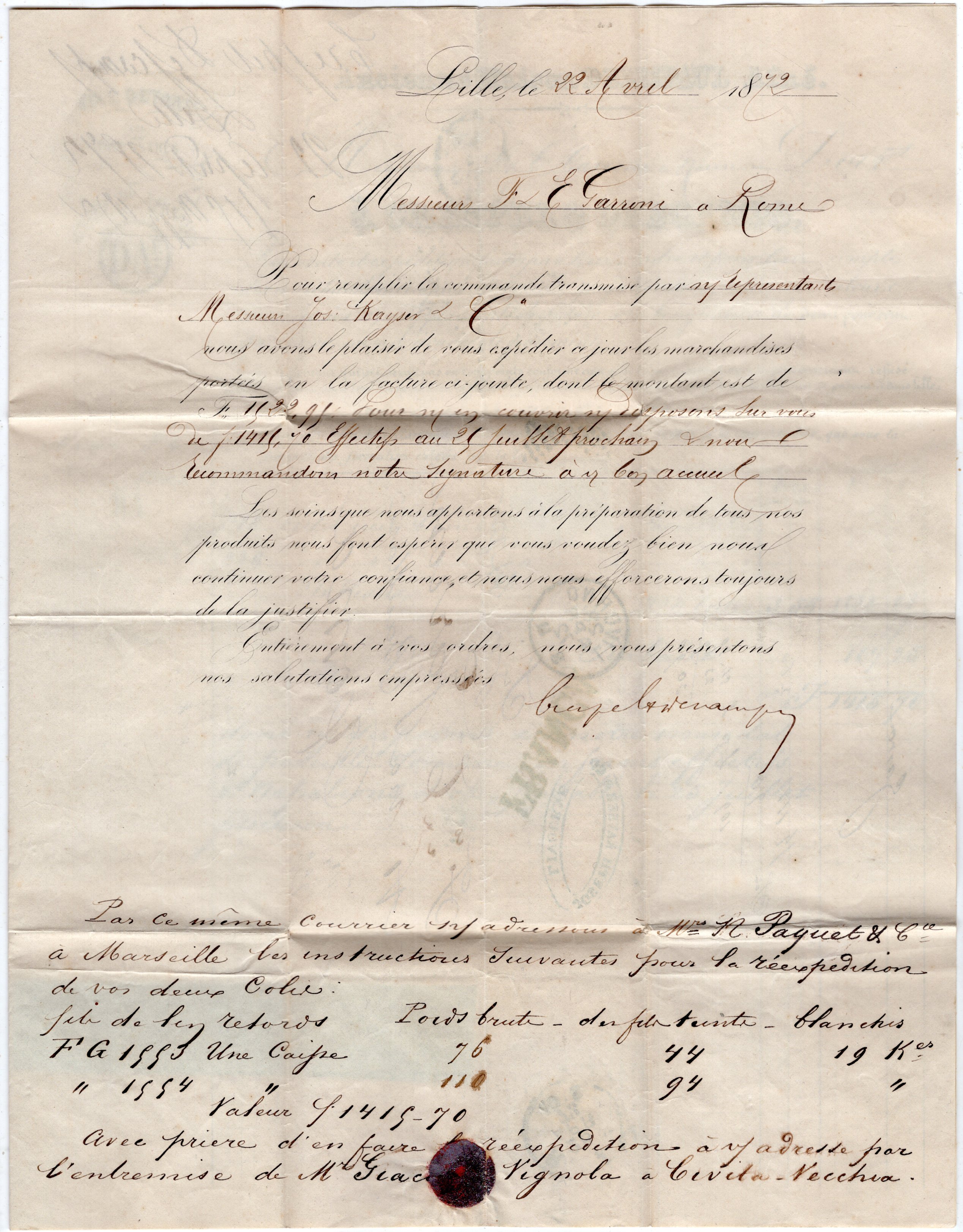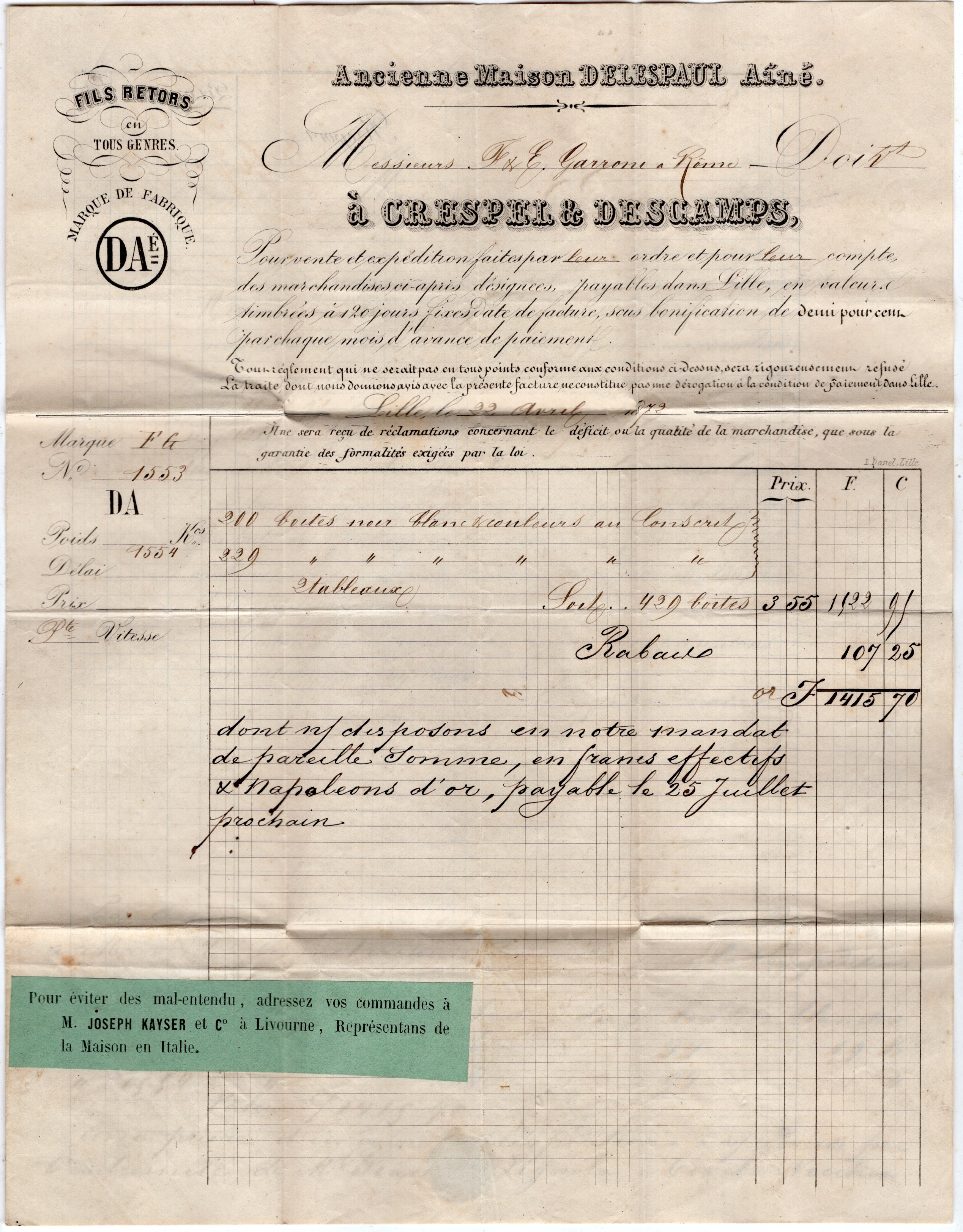 Crespel & Descamps haben wohl mit Joseph Kayser eine Exklusiv-Vereinbarung gehabt (durchaus im internationalen Handel nicht unüblich) und haben die Rechnung, die vermutlich für eine Bestellung, die direkt nach Lille geschickt worden war, nach Livorno geschickt, wo Joseph Kayser diese zur Kenntniss nehmen und in seinen Provisionsabrechnungen berücksichtigen sollte. Die 20 Centesimi für das Porto von Livorno nach Rom wird Joseph Kayser gerne gezahlt haben, dürfte bei über 1400 Francs Rechnungswert in der daraus ergebenden Provisionszahlung locker zu verschmerzen sein. Vermutlich haben die Nordfranzosen diese (und vermutlich auch andere Rechnungen) in einem größeren Paket, in dem auch Ware gewesen sein könnte, nach Livorno geschickt.